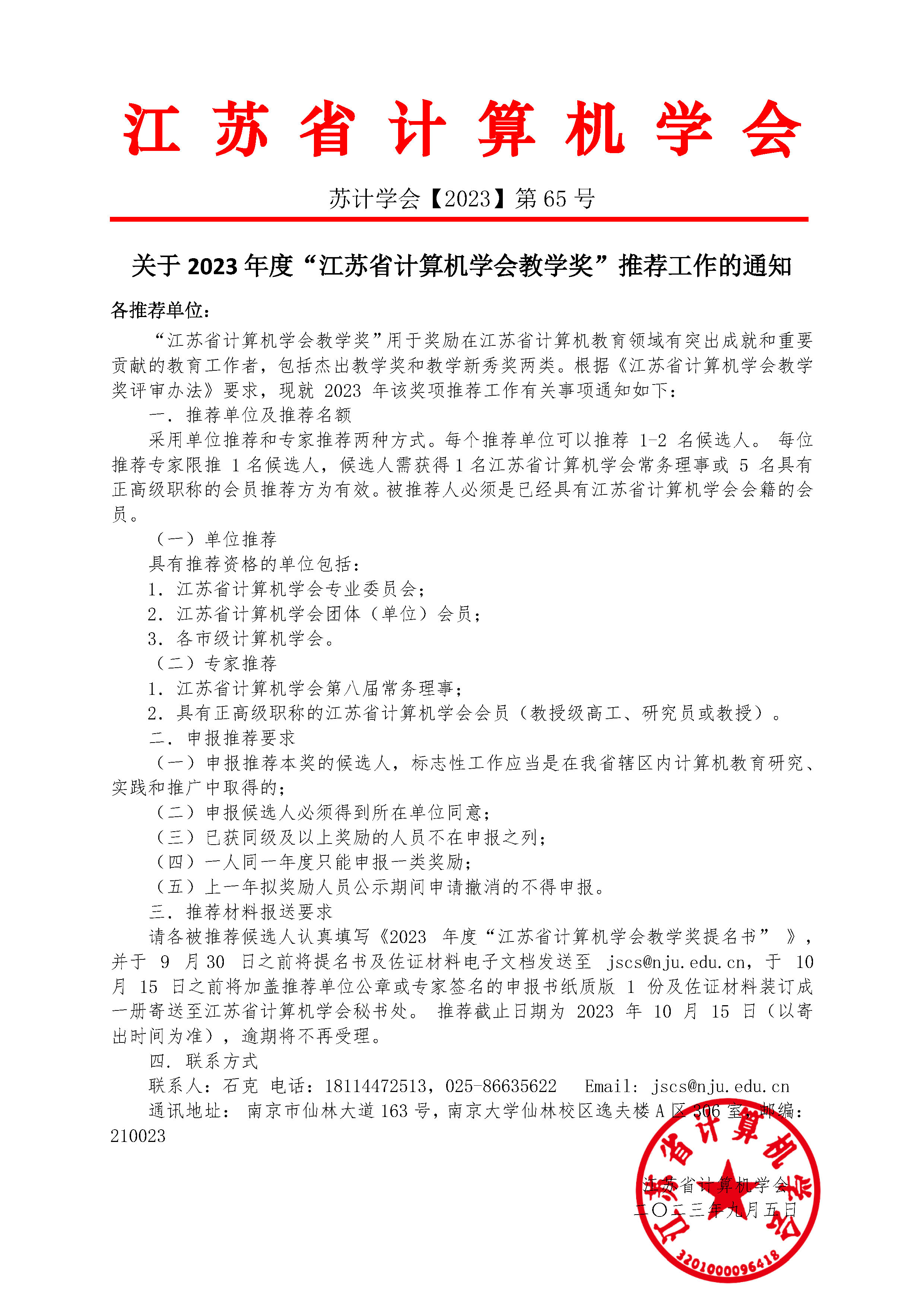 秘书处市内联络点 地址: 江苏省南京市汉口路22号 邮编:210093 电话/传真:025-86635622