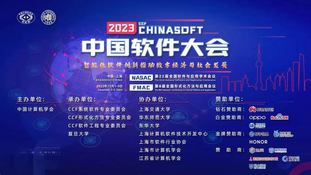 由中国计算机学会(CCF)主办,江苏省计算机学会(JSCS)协办的2023年CCF中国软件大会(CCF ChinaSoft 2023)将于2023年12月1-3日在上海国际会议中心举行。