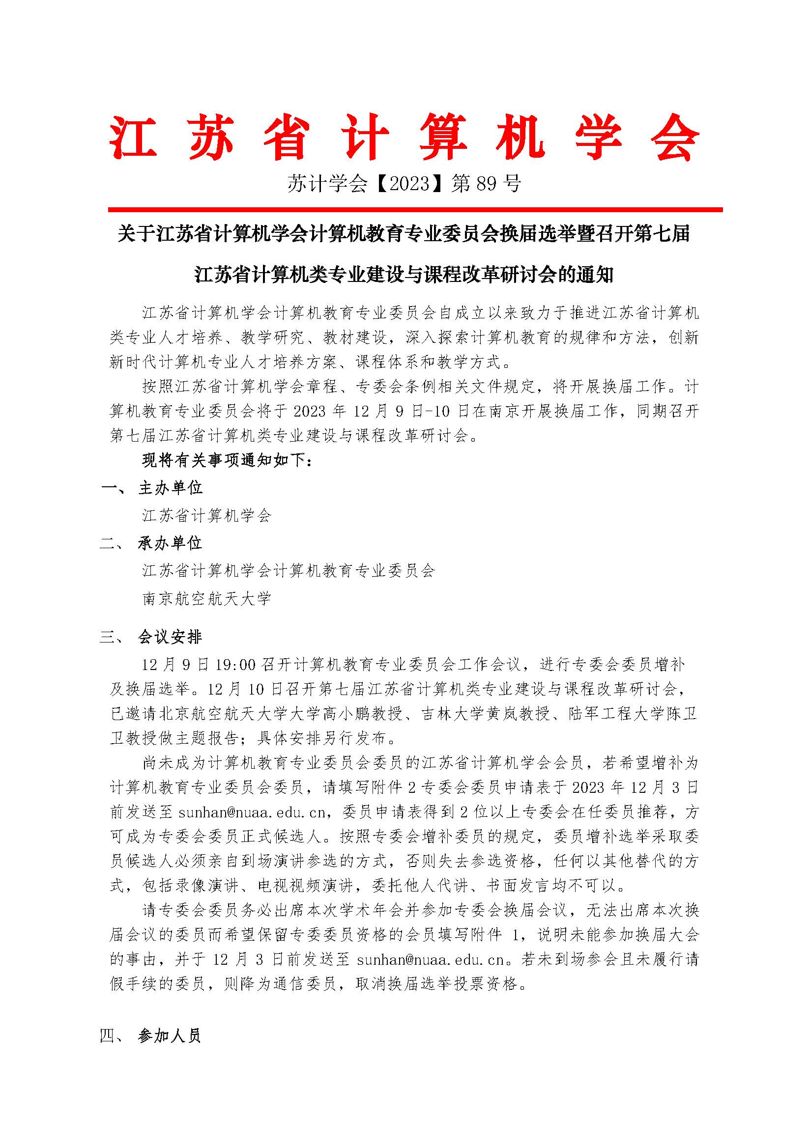 关于江苏省计算机学会计算机教育专业委员会换届选举暨召开第七届江苏省计算机类专业建设与课程改革研讨会的通知