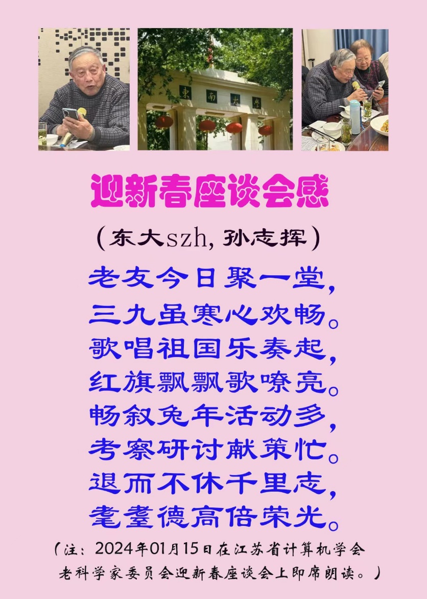 2024年1月15日,江苏省计算机学会老科学家委员会,在南京南瑞路的凤凰环球酒店西苑饭庄金陵厅召开了迎新春座谈会。参加的有部分老科委成员,省学会秘书处的同志,共20多人。