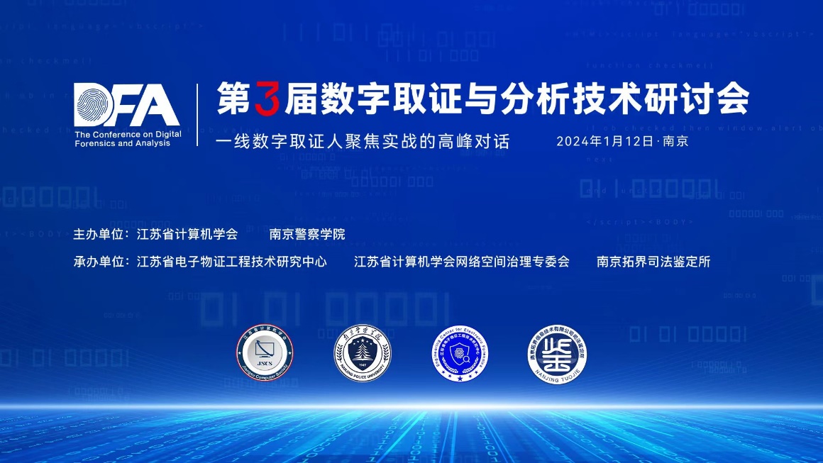 2024年1月12日,由学会主办、网络空间治理专委会承办的第三届数字取证与分析技术研讨会(DFA 2024)在南京圆满落幕。网络空间治理专委会主任蒋平,专委会秘书长王新猛,20余位专委会委员,以及来自全国公安、检察、司法、市场监管等单位的近500名嘉宾参会。金莹秘书长,南京市司法局党组副书记、副局长徐晓洁等领导出席会议并致辞,会议由南京警察学院杨一涛教授主持。