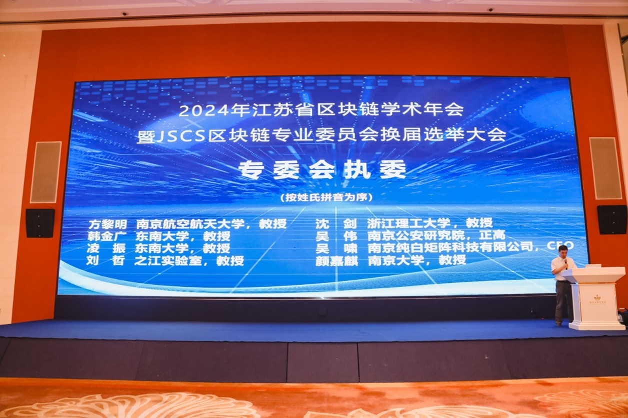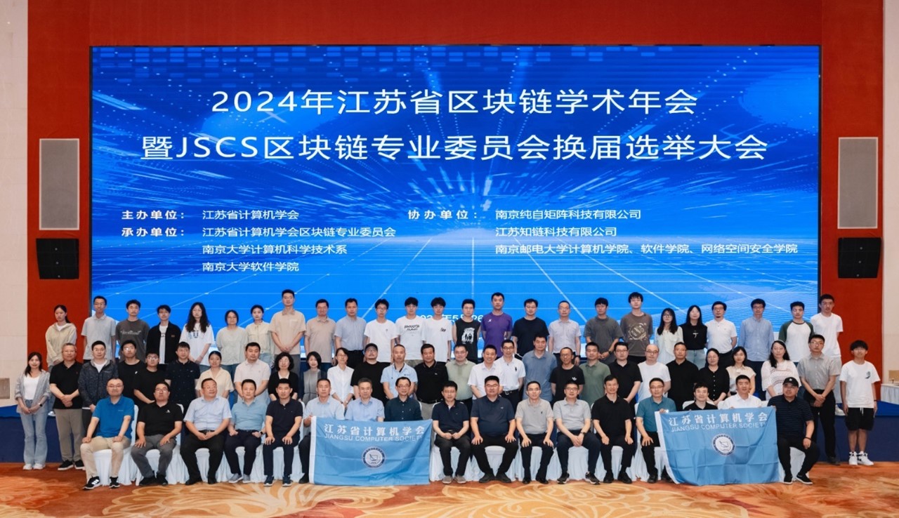 2024年5月26日下午,江苏省区块链学术年会暨JSCS区块链专业委员会换届选举大会在南京市成功召开。江苏省计算机学会区块链专委会主任仲盛教授、专委会委员,以及来自江苏省及周边地区高校、龙头企业、行业协会的知名专家、学者近百人参会。本次会议由江苏省计算机学会主办,江苏省计算机学会区块链专业委员会、南京大学计算机科学与技术系、南京大学软件学院共同承办,南京纯白矩阵科技有限公司、江苏知链科技有限公司和南京邮电大学计算机学院、软件学院、网络空间安全学院协办。