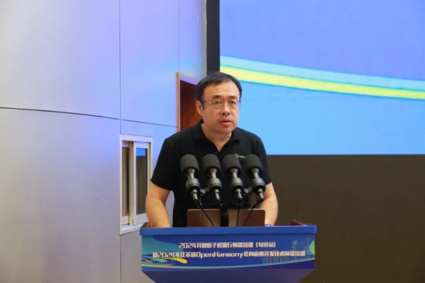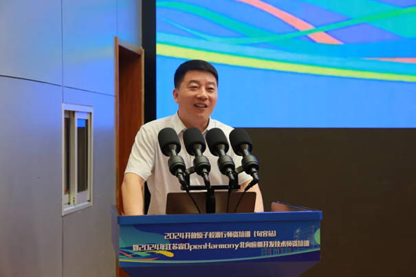 江苏农林职业技术学院党委委员、副校长颜志明做领导致辞,他在致辞中表示:“在大家的共同努力下,OpenHarmony必将在我省乃至全国的高校中生根发芽、开花结果,我们也将为培养更多具有创新精神和实践能力的计算机专业人才贡献智慧和力量。”