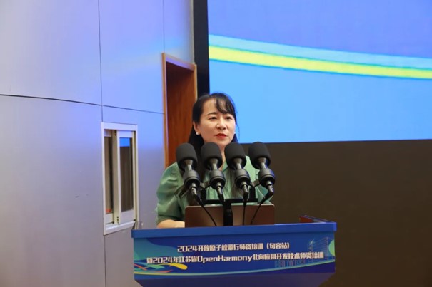 江苏省计算机学会秘书长金莹代表江苏省计算机学会做了领导致辞,她表示:“通过此次拓维信息和开鸿智谷的培训,参训教师不仅能够掌握OpenHarmony的核心技术和开发方法,更能够深刻理解其背后的技术理念和发展趋势,从而在未来的教学实践中,更好地引导学生探索未知、勇于创新。同时,也期待通过此次活动,进一步加强企业与高校之间的合作交流,共同推动OpenHarmony技术在教育领域的应用与推广。”