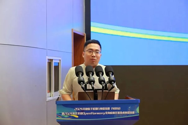 开鸿智谷产业与人才发展部课程总监王浩先生,为本次师资培训做了详细课程介绍,他说到,开鸿智谷希望通过此次师资培训实现硬件互助、资源共享,为开源领域带来更多的教师力量,帮助培养更多开源技术人才,促进生态繁荣,随后,王浩老师邀请在场所有老师参与师资培训万人计划。(注:0penHarmony教师培养万人计划旨在五年内培养10000名教师,使其全面了解0penHarmony并掌握相关技术。)