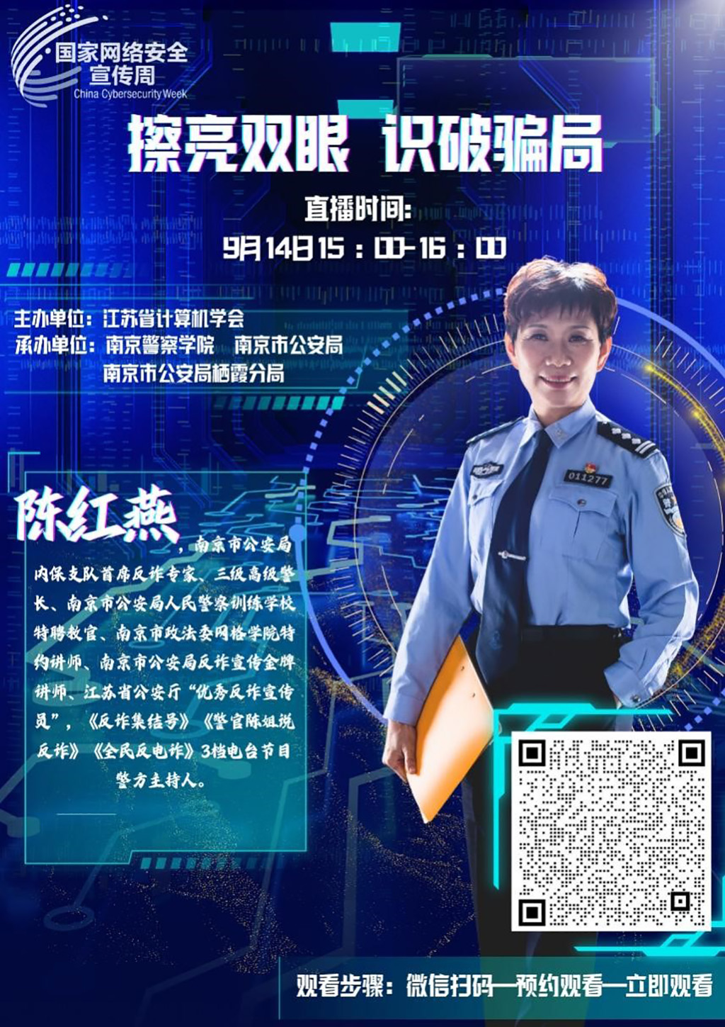 随着2024年国家网络安全宣传周以及即将拉开序幕的江苏省教育系统反诈宣传月的临近,江苏省计算机学会主办了一场面向高校大学生的防范电信网络诈骗科普宣传讲座。该活动由南京警察学院、南京市公安局及南京市公安局栖霞分局联合承办,并于9月14日下午成功举行。讲座荣幸地邀请到南京市公安局内保支队的陈红燕警官作为主讲人。活动通过企业微信线上直播与南京警察学院线下现场相结合的方式进行,吸引了超过3000名高校大学生的积极参与。