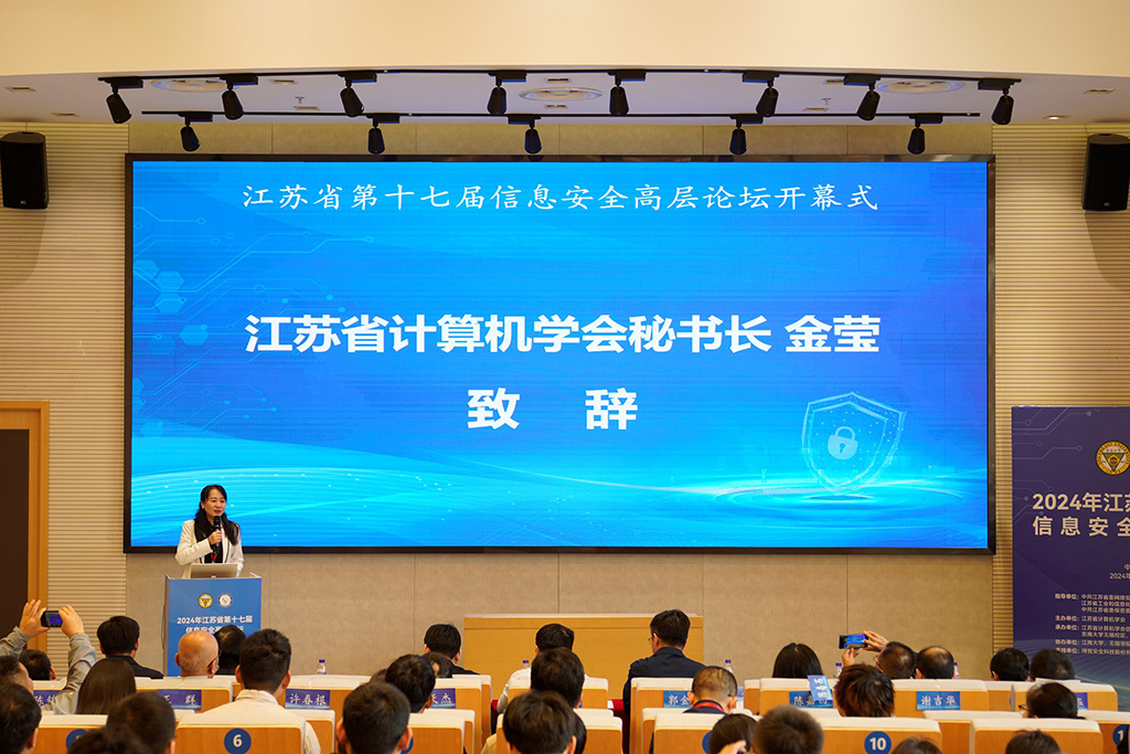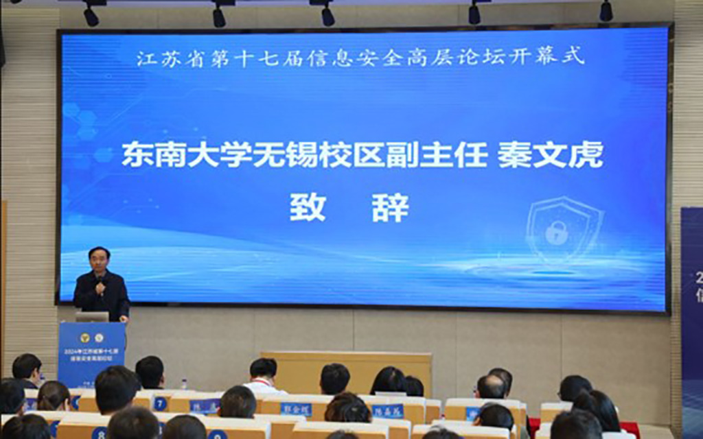 江苏省计算机学会信息安全专委会主任、东南大学网络空间安全学院副院长陈立全教授主持开幕式。东南大学无锡校区秦文虎副主任、江苏省通信管理局马旸副局长、无锡市委网信办鲁新龙副主任、江苏省计算机学会金莹秘书长出席开幕式并致辞。