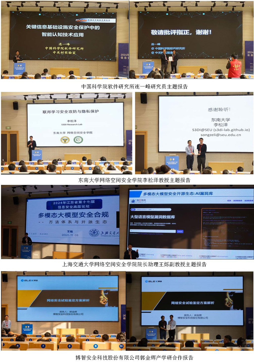 本届论坛特邀中国科学技术大学网络空间安全学院执行院长俞能海教授、武汉大学国家网络安全学院何德彪教授、暨南大学网络空间安全学院黄欣沂教授、上海大学通信与信息工程学院王潮教授、中国科学院软件研究所连一峰研究员、东南大学网络空间安全学院李松泽教授、上海交通大学网络空间安全学院院长助理王烁副教授分别围绕“大数据人工智能时代数据安全的发展”、“SecureGPT: GPT模型的隐私保护安全多方推理”、“面向大额交易的可撤销延迟支付协议”、“量子效应驱动人工智能密码设计与攻击”、“关键信息基础设施安全保护中的智能认知技术应用”、“联邦学习安全攻防与隐私保护”、“多模态大模型安全合规:方法体系与开源生态”等方面做专题报告。专家重点聚焦信息安全技术前沿热点,探讨国内外信息安全前沿创新性技术发展方向和重大热点安全事件,就人工智能时代数据安全面临的挑战、ChatGPT带来新的安全问题、人工智能密码攻击、多模态大模型安全等方面的研究现状与最新成果及未来研究方向进行展望和探讨,推动科技研究和技术创新成果在业界的共享共用。针对产学研合作,博智安全科技股份有限公司工业互联网产品运营部郭金辉总经理进行了“网络安全试验鉴定方案解析”的专题报告分享,公安部第三研究所《信息网络安全》杂志社陈嘉茜编辑针对期刊投审稿和行业学术交流等方面进行了交流。本届论坛特邀报告分别由南京信息工程大学付章杰教授、南京大学华景煜教授、东南大学韩金广教授、南京航空航天大学朱友文教授、南京理工大学付安民教授等五位专家主持并为特邀报告专家颁发感谢状。