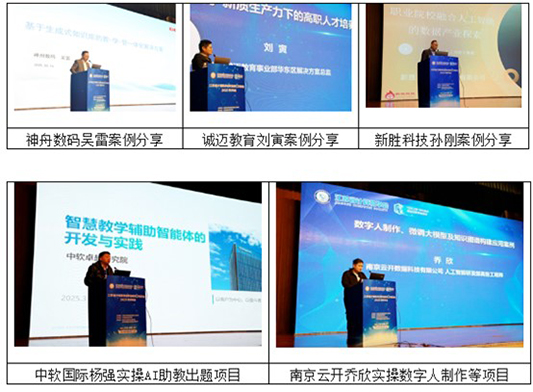 来自企业的北京神州数码云科信息技术有限公司吴雷总监展示了《生成式知识库在“教-学-管”全链条中的应用案例》,为职教数字化转型提供新思路。诚迈科技(南京)股份有限公司的刘寅总监分享了《新质生产力下的高职人才培养案例》,展示了诚迈在信创,鸿蒙,大模型人才培养方面的思路和见解。新胜科技(上海)有限公司孙刚总经理分享《 职业院校融合人工智能的数据产业探索》提出了职业院校在可信数据空间基础设施建设、运营的商业机遇和职业数据人才建设及产学研融合的数据产业发展思路。在手把手实战-AI赋能职业教育板块中,中软国际教育公司的杨强先生分享《DeepSeek职教场景落地实战-手把手带您实现AI助教出题》,南京云开数据科技有限公司的人工智能研发部经理乔欣介绍《数字人制作、微调大模型及知识图谱构建应用案例》。演示案例实现的步骤,与参会代表共同探讨了AI在职业教育中的实际应用,激发了参会代表进一步应用AI工具辅助教学的学习兴趣。