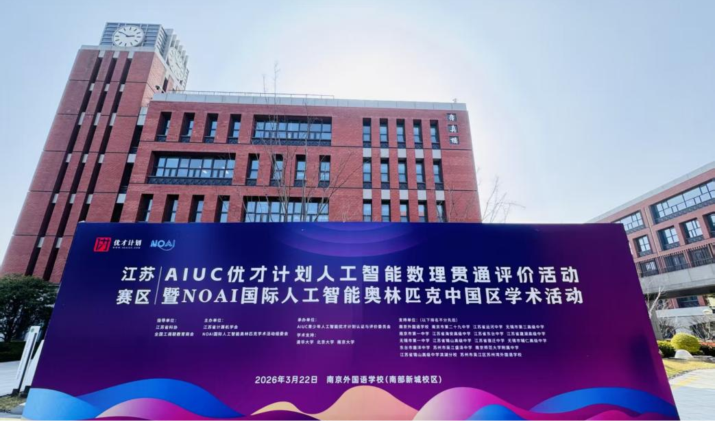 3月22日,由江苏省计算学会主办的AIUC优才计划人工智能数理贯通评价活动暨NOAI国际人工智能奥林匹克中国区学术活动在南京外国语学校圆满落幕。本次活动以大学、中学、小学贯通式教育为核心模式,依托清华大学、北京大学、南京大学、东南大学等高校的学科优势与专家资源,通过高标准、高水平的学术评价平台,加速人工智能领域拔尖创新人才的早期发现与系统培养,构建“中小学—高校—科研院所”协同育人新机制。