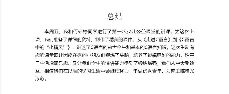 在此次特殊的志愿者服务活动中,计算机与软件学院的志愿者们踊跃参与,纷纷表示希望能在此时为祖国战疫情工作尽自己的一份绵薄之力,要让那些不管是父母在身旁还是父母在前线工作的小朋友们感受到我们的温暖。在本次志愿者活动中,大学生们志愿者们通过一系列讲课,增强自身的服务意识,丰富假期生活的同时极大地提高自身的综合素质,展现出了南工院大学生互助友好的精神风貌。每一名志愿者都把它当作自己的责任在履行,每个人都很清楚需要为此做什么。糟糕的日子熬过去了,剩下的全是好运,待疫情结束之时,定是春暖花开之日。