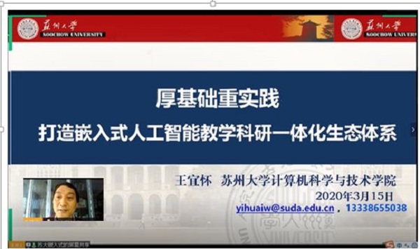 嵌入式系统与物联网专委会副主任委员南京大学谢磊副教授主持了本次在线论坛,江苏省计算机学会金莹秘书长代表省学会祝贺嵌入式系统与物联网专委会举办的2020年嵌入式人工智能创新论坛在线顺利召开!同时希望相关科学研究能够在当下的疫情防控中发挥赋能作用,更能在疫情过后引领相关产业的发展,成为我国经济发展的创新驱动力之一。随后专委会主任苏州大学王宜怀教授代表专委会致辞。