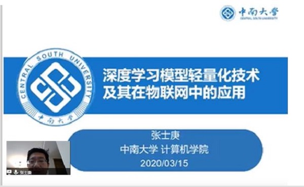 3、 中南大学张士庚副教授做特邀报告“深度学习模型轻量化技术及其在物联网中的应用”,介绍了在端-边-云协同的环境中的深度学习轻量化技术,并探讨其在物联网安全、移动智能以及无线射频识别等领域的应用。