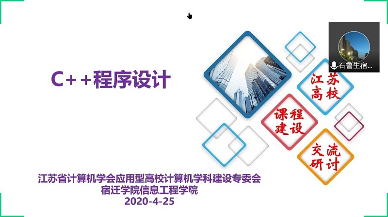 为响应党和政府关于应对新冠病毒疫情的号召,江苏省高校C++程序设计课程建设研讨会,于2020年4月25日在线上通过视频会议召开。来自东南大学成贤学院、南京工业大学浦江学院、江苏科技大学苏州理工学院、宿迁学院、南京大学出版社等相关单位代表,出席了本次会议。本次线上会议由江苏省计算机学会应用型高校计算机学科建设专家委员会主办,宿迁学院承办,执行秘书长苗庆松先生代表专委出席。
