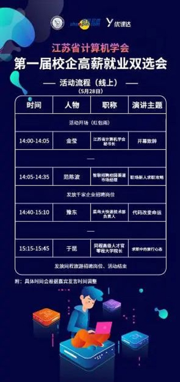 情之下,就业困难,为进一步响应教育部等部门的号召,更好的帮助江苏省IT信息类高校毕业生就业,由江苏省计算机学会主办,智联招聘、优课达教育、同程旅游承办,一九零二创业咖啡、南京师范大学常州创新发展研究院协办的江苏省计算机学会第一届校企高薪就业双选会于5月28日于线上隆重举行。