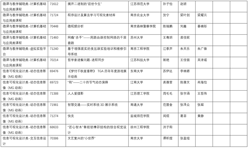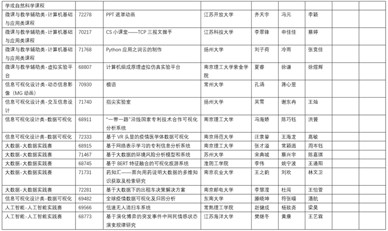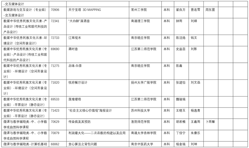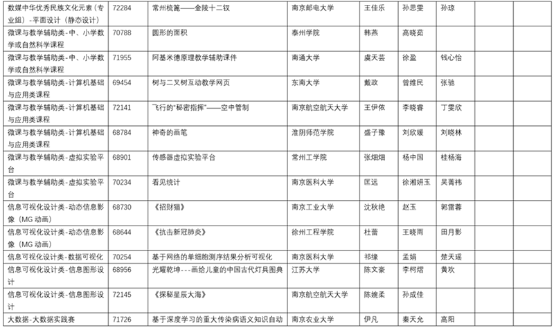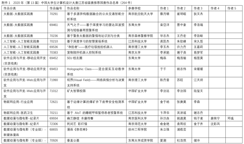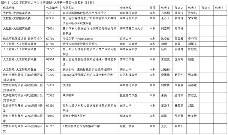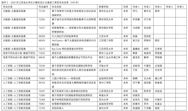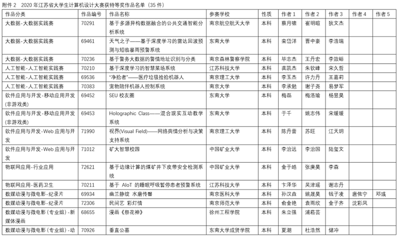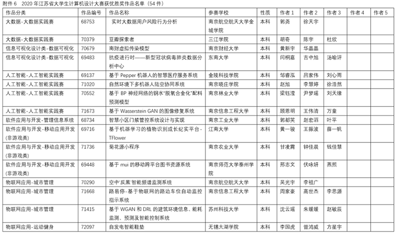 2020年6月6日由南京航空航天大学举办了2020年江苏省大学生计算机设计大赛暨2020年(第13届)中国大学生计算机设计大赛江苏省级赛的在线决赛。决赛根据作品类别和数量分为14组同时进行,邀请了来自省内各院校相关领域的42位专家作为决赛评委,大赛仲裁组3位成员和监督组3位成员对现场决赛进行了巡视和监督。决赛采用现场答辩的方式,每件作品总答辩时间不超过20分钟。经过一天激烈的角逐,共评出特等奖作品35件,一等奖作品52件,二等奖作品71件,三等奖作品140件,优胜奖作品54件(详情见附件2、附件3、附件4、附件5、附件6)。此外,共47人次获得优秀教师指导奖(见附件7)。22人获得优秀管理员奖(见附件8)。20所院校获得优秀组织奖(见附件9)。