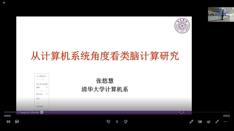 清华大学计算机系研究员张悠慧(北京市智源学者)在线上做了《从计算机体系结构角度看类脑计算》前沿主题报告,报告从采用什么样的生物真实性、如何高效使用新型器件、如何设计“类脑计算机”体系结构等的体系结构角度出发来介绍类脑计算完备性与类脑计算机层次结构的设计相关工作。