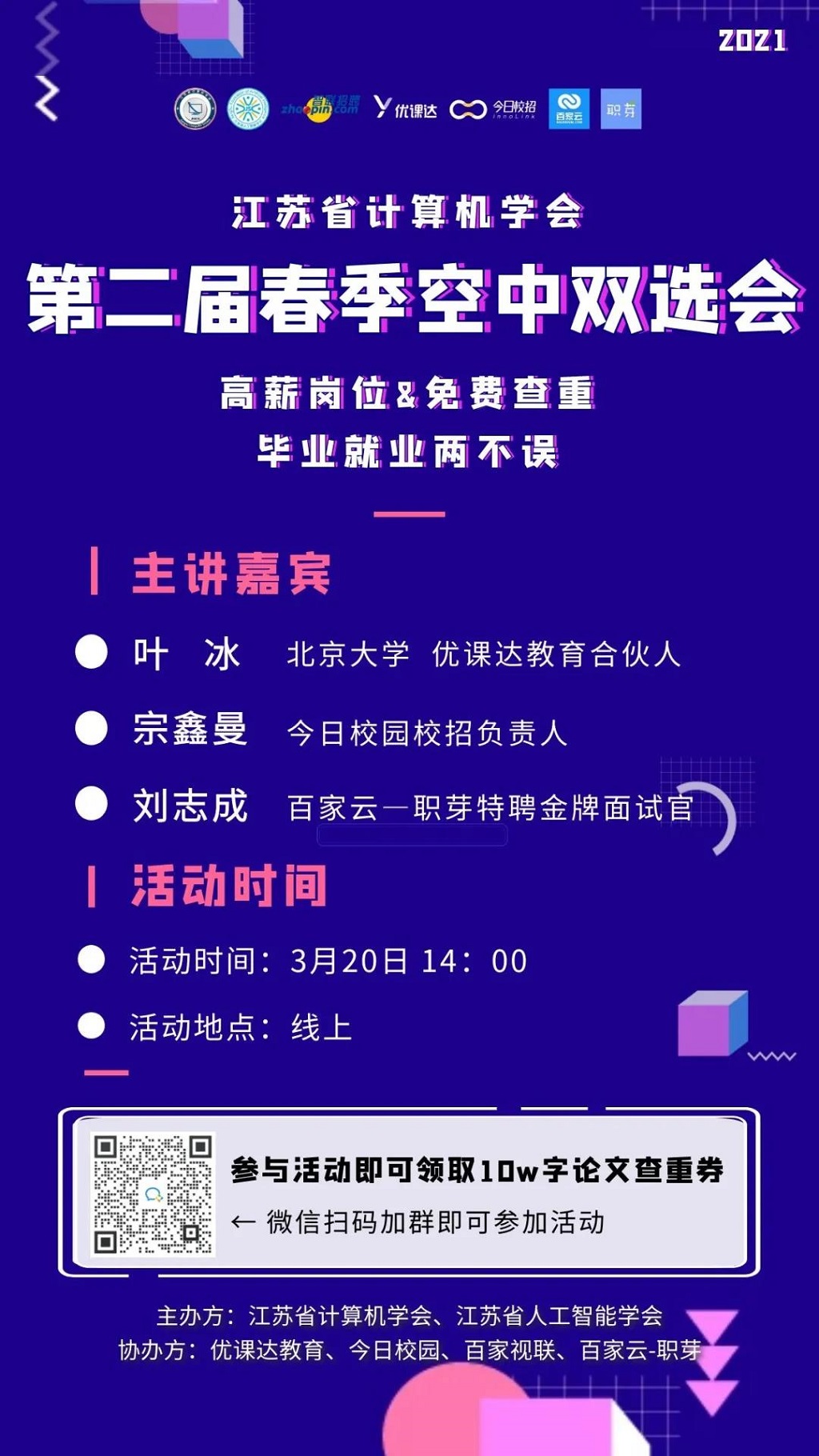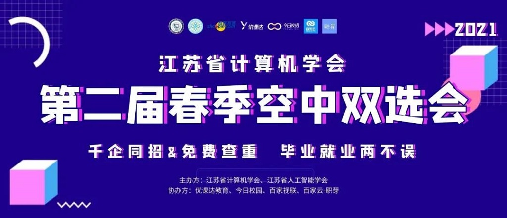 正所谓金三银四,现在三月份实在是应届生找工作的黄金时期。而双选会就是为我们应届生量身打造的一个就业机会,为了更好的帮助江苏省IT信息类高校毕业生就业,由江苏省计算机学会、江苏省人工智能学会主办,智联招聘、优课达教育、今日校招、百家智联、百家智联-职芽承办的江苏省计算机学会第二届春季空中双选会于3月20日于线上隆重举行。