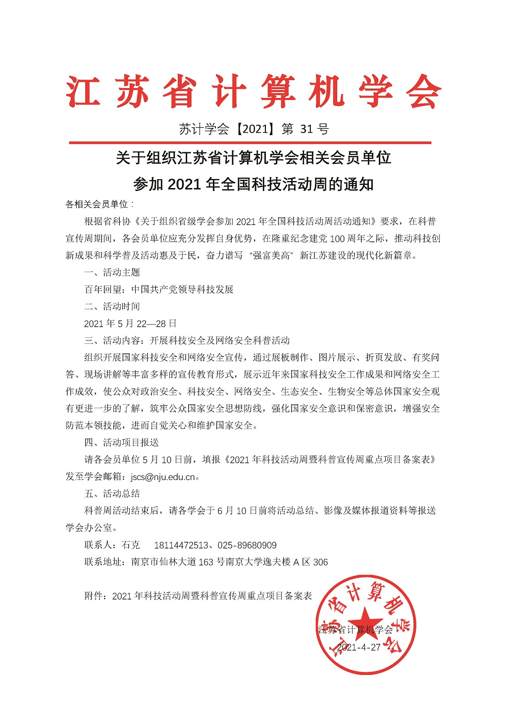 秘书处市内联络点 地址: 江苏省南京市汉口路22号 邮编:210093 电话/传真:025-86635622