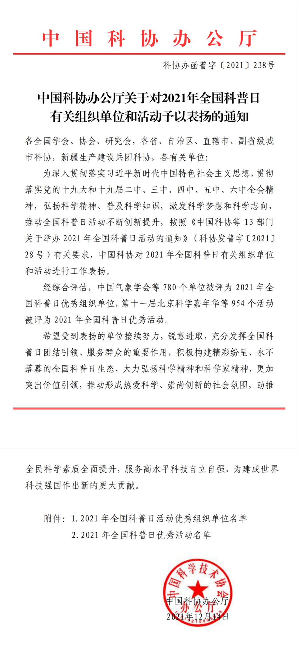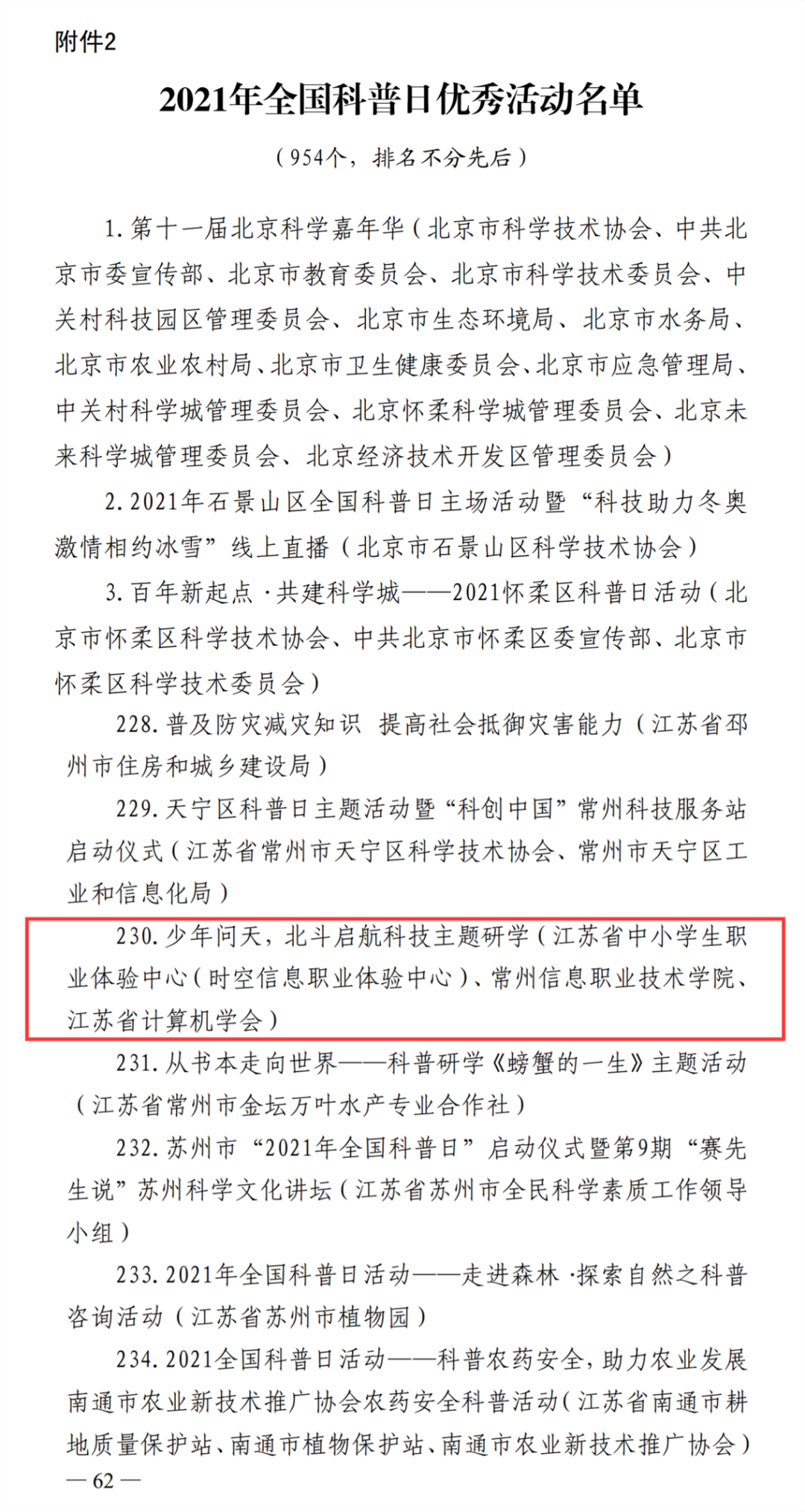 日前,中国科协办公厅印发《关于对2021年全国科普日有关组织单位和活动予以表扬的通知》(科协办函普字〔2021〕238号),全国780个单位被评为2021年全国科普日优秀组织单位,954个活动被评为2021年全国科普日优秀活动。其中由我学会与江苏省中小学生职业体验中心(时空信息职业体验中心)、常州信息职业技术学院共同主办的“少年问天,北斗启航科技主题研学”榜上有名,获评2021年全国科普日优秀活动。