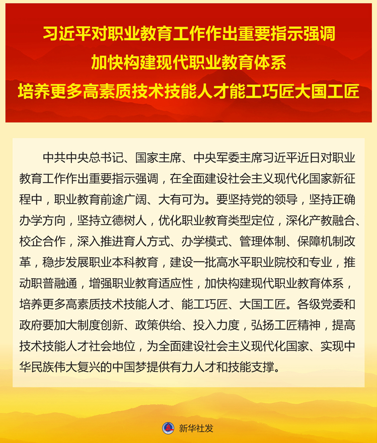 新华社北京4月13日电 中共中央总书记、国家主席、中央军委主席习近平近日对职业教育工作作出重要指示强调,在全面建设社会主义现代化国家新征程中,职业教育前途广阔、大有可为。要坚持党的领导,坚持正确办学方向,坚持立德树人,优化职业教育类型定位,深化产教融合、校企合作,深入推进育人方式、办学模式、管理体制、保障机制改革,稳步发展职业本科教育,建设一批高水平职业院校和专业,推动职普融通,增强职业教育适应性,加快构建现代职业教育体系,培养更多高素质技术技能人才、能工巧匠、大国工匠。各级党委和政府要加大制度创新、政策供给、投入力度,弘扬工匠精神,提高技术技能人才社会地位,为全面建设社会主义现代化国家、实现中华民族伟大复兴的中国梦提供有力人才和技能支撑。