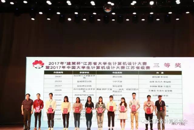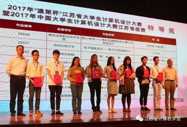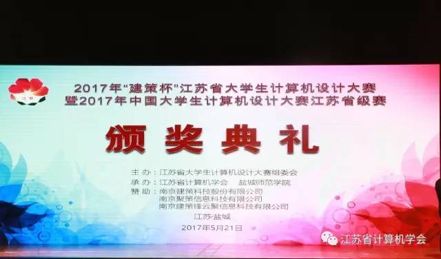 2017年“建策杯”江苏省大学生计算机设计大赛暨2017年中国大学生计算机设计大赛江苏省级赛的现场决赛,于5月20日在盐城师范学院通榆校区开赛,21日上午在该校区南园大礼堂举行了隆重的颁奖典礼,同时,推荐50所院校175件获奖作品参加今年暑期进行的中国大学生计算机设计大赛。