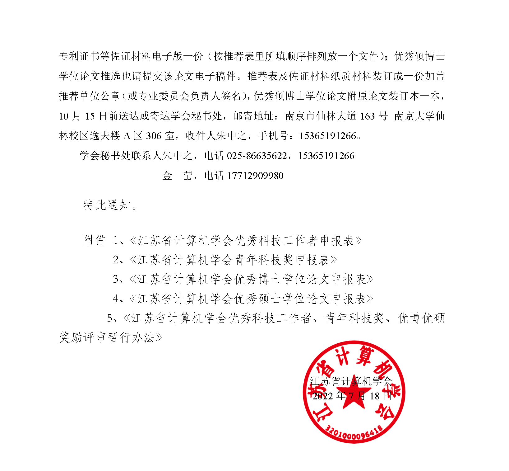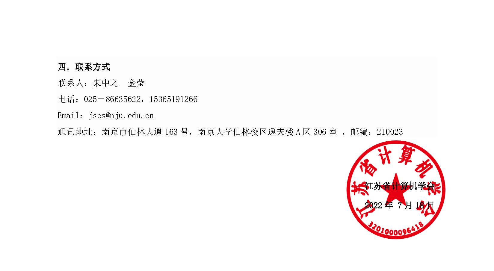 秘书处市内联络点 地址: 江苏省南京市汉口路22号 邮编:210093 电话/传真:025-86635622