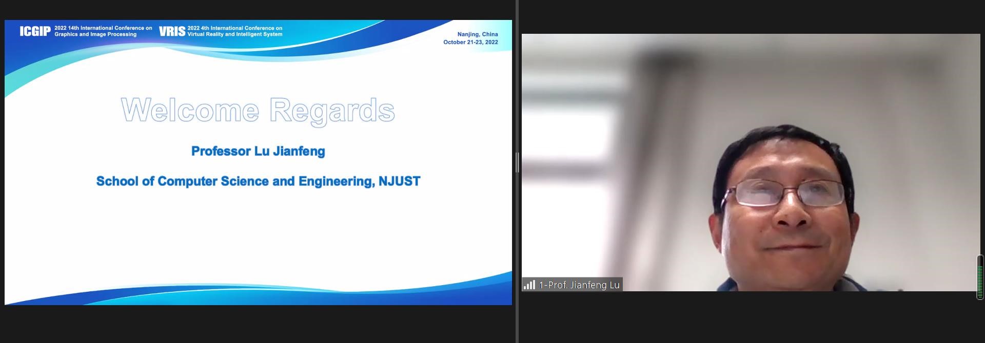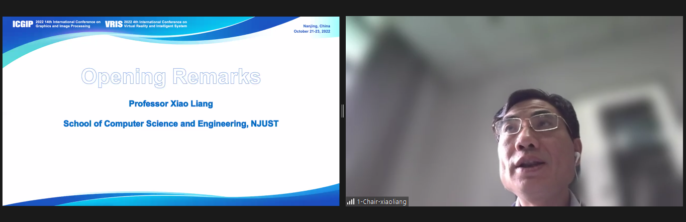 2022年第十四届图形与图像处理国际会议(ICGIP 2022) 于 2022年10月21-23日在江苏南京(线上)召开。本次会议由南京理工大学主办,南京理工大学计算机科学与工程学院、 江苏省计算机学会、江苏省人工智能学会联合承办。本次大会由南京邮电大学桂冠教授主持;南京理工大学陆建峰教授致欢迎词;大会主席由江苏省计算机学会学术工委执行主任南京理工大学肖亮教授担任,并致开幕词。