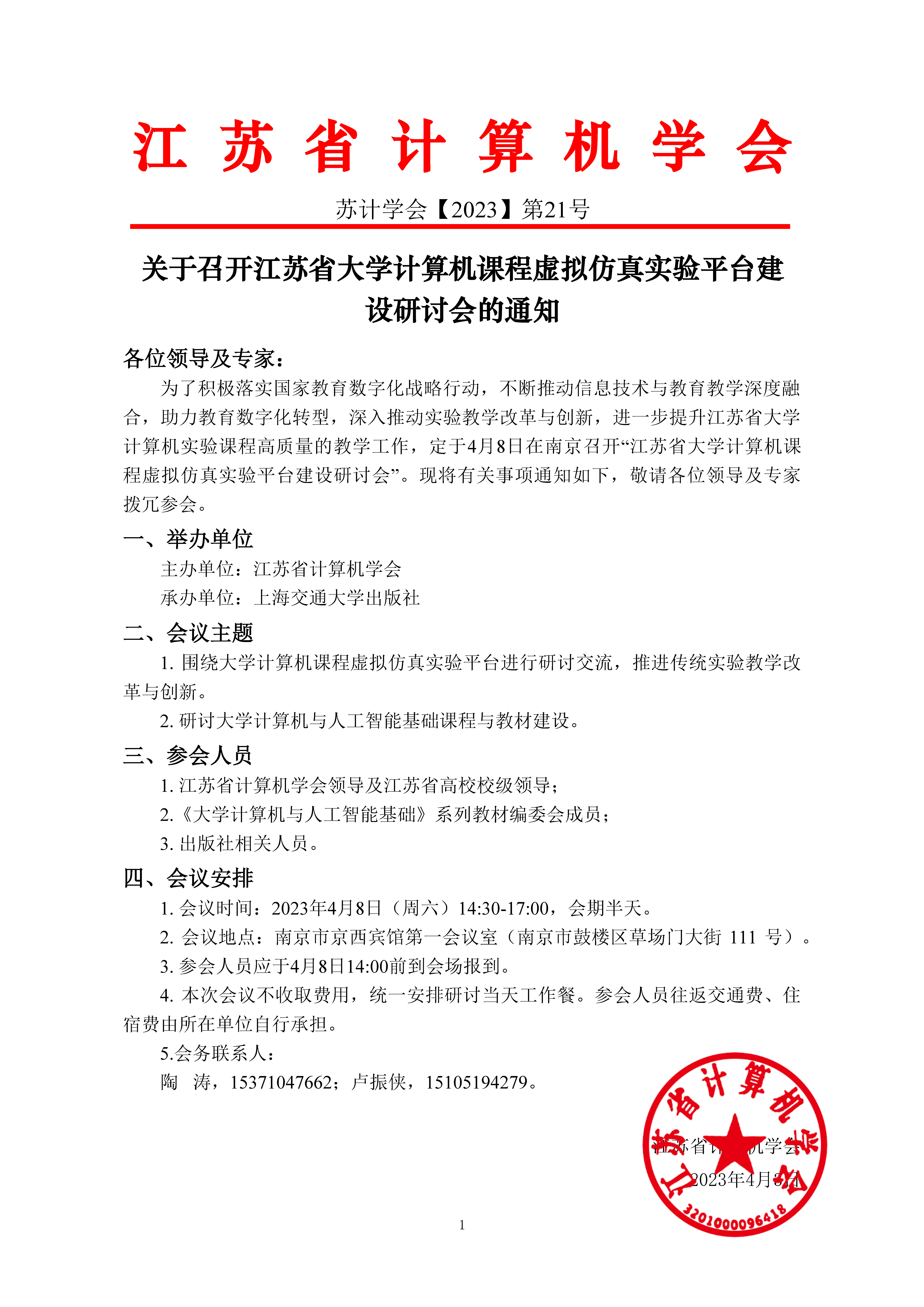 秘书处市内联络点 地址: 江苏省南京市汉口路22号 邮编:210093 电话/传真:025-86635622