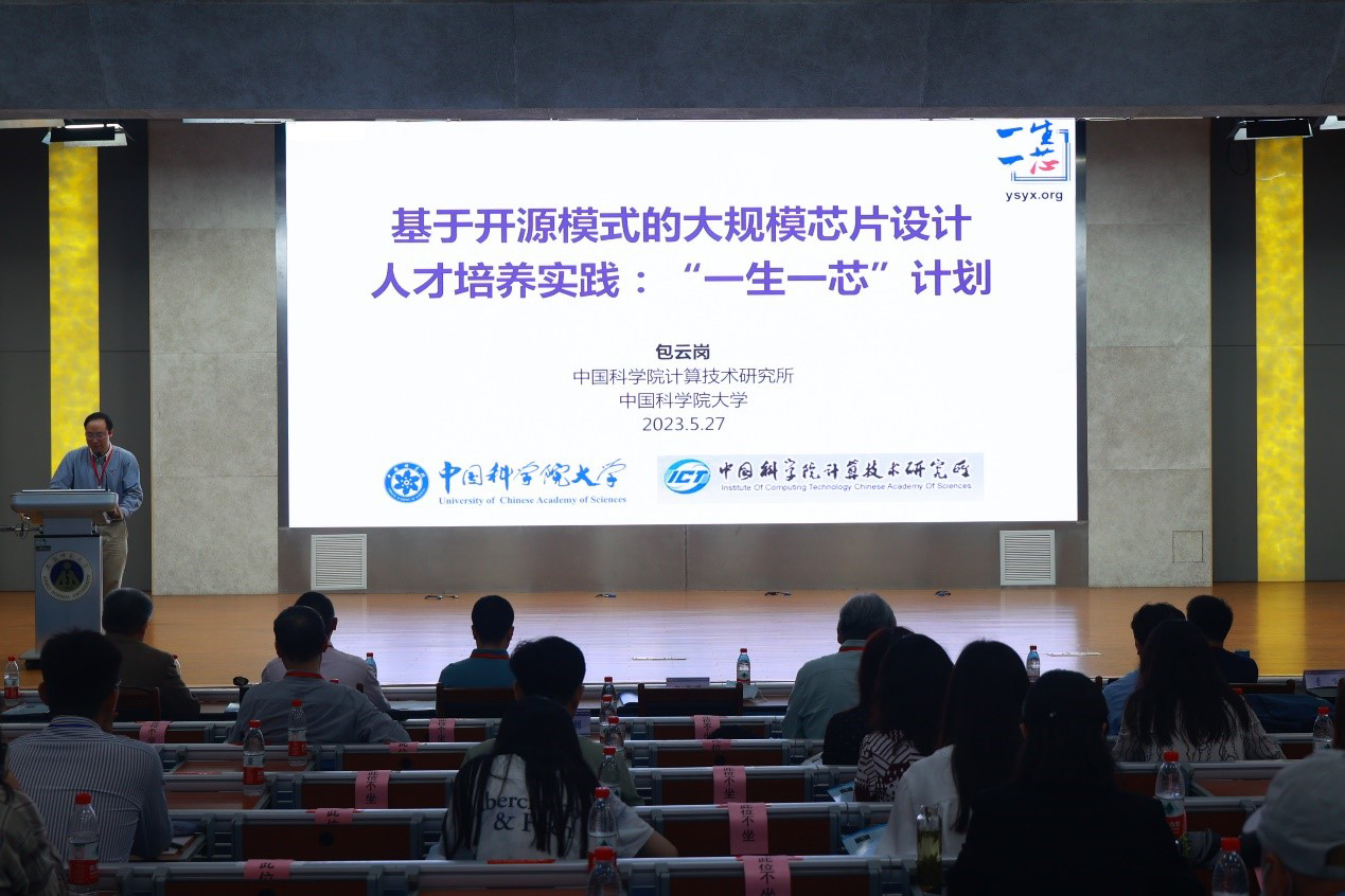 中国科学院计算技术研究所副所长、中国科学院大学计算机学院副院长包云岗研究员以《基于开源模式的大规模芯片设计人才培养实践:“一生一芯”计划》为题,针对处理器芯片设计人才储备严重不足,就如何大规模高质量培养此类人才以促进我国处理器芯片产业发展,介绍了2019年8月中国科学院大学启动的“一生一芯”计划,以开源芯片为切入点,以处理器芯片敏捷开发方法为实验手段,将计算机科学(CS)与电子信息工程(EE)专业课程进行贯通式设计,突出科教融合特色,理论与实践并重,通过教学流片计划实现硅上处理器教学,“让学生带着自己设计的处理器芯片毕业”,培养计算机系统领域全栈式拔尖人才。报告分析了“一生一芯”计划实施五期过程中形成的经验与教训,对于我国培养战略紧缺人才具有重要引领作用。