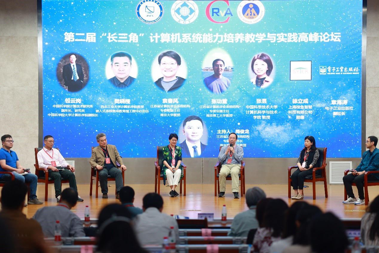在Panel环节,江苏省计算机系统结构专委会秘书长,南京理工大学周俊龙教授主持,中国科学院计算技术研究所副所长、中国科学院大学计算机学院副院长包云岗研究员,江苏省计算机学会系统结构专委会主任、南京理工大学张功萱教授,西北工业大学计算机学院樊晓桠教授,江苏省计算机学会系统结构专委会副主任、南京大学计算机系袁春风教授,中国科学技术大学计算机科学与技术学院张昱教授,电子工业出版社章海涛副社长,以及上海梭鱼智能科技有限公司徐立成经理等七位专家,共同交流了计算机系统能力培养教学与实践的经验,提出了很多真知灼见的建议。