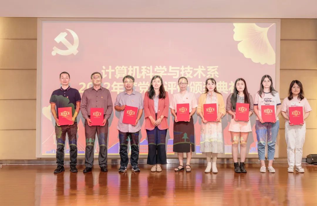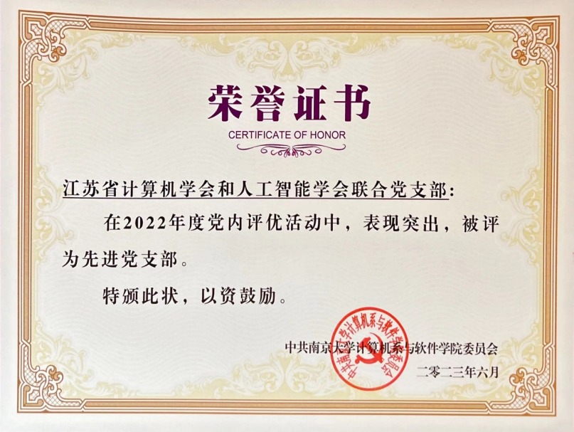 在2022年度中共南京大学计算机系与软件学院委员会党内评优活动中,江苏省计算机学会和人工智能联合党支部获得先进党支部称号。党支部书记金莹同志获得先进党务工作者称号!