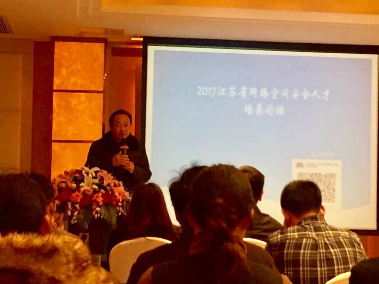 2017年1月5日,江苏省高等学校网络空间安全人才培养论坛在南京金汇大酒店全天举行,产学研各界70 人参加,论坛由江苏省计算机学会主办,北京易霖博信息技术有限公司承办。应邀来论坛演讲的知名专家有我国网络空间安全一级学科主要倡导者、中国工程院院士沈昌祥,中国保密协会会长杜虹,神州网云总裁李宗洋,华为企业网络产品线首席安全架构师钱晓斌,全军信息安全技术研究中心主任、解放军理工大学教授张涛等。江苏省计算机学会杨献春秘书长代表主办方致开幕词,省计算机学会信息安全专委会主任傅德胜和江苏省"网络与信息安全"科技传播首席专家、南京邮电大学教授杨庚分别担任上、下午论坛主持。省计算机学会教育工委主任陶先平、省计算机学会网络空间安全职业教育专委会主任聂明也出席了论坛。