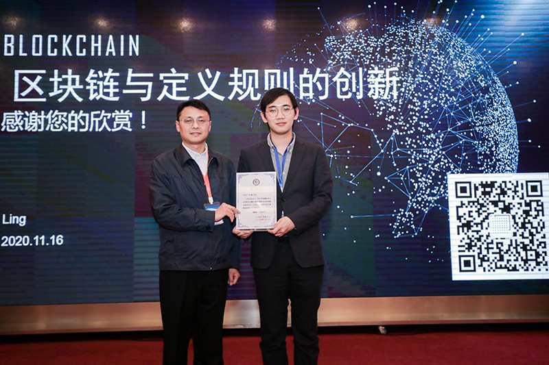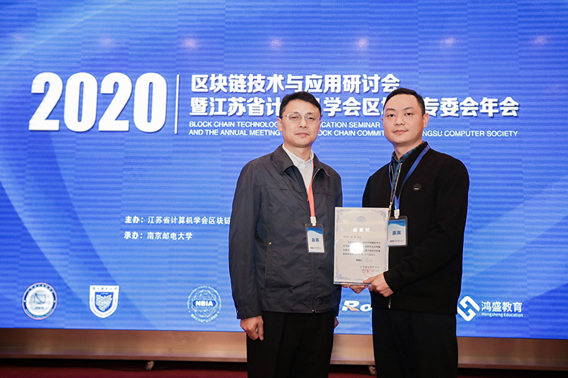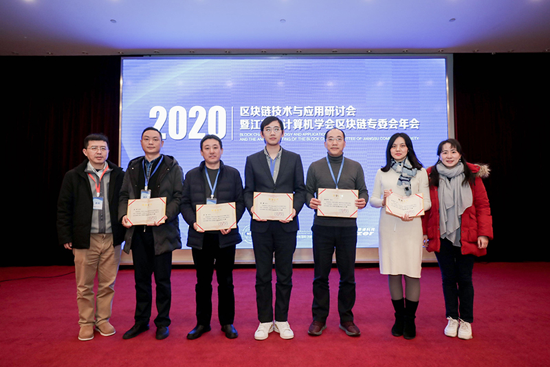 本次年会的最后,为表扬和鼓励积级参加、支持江苏省计算机学会区块链专委会学术、科技服务、科普活动的人员,由江苏省计算机学会区块链专委会主任、南京大学仲盛教授及江苏省计算机学会秘书长金莹教授共同为冯扬悦、徐劲松、吴啸、王剑、洪明等五位突出贡献者颁发了江苏省计算机学会区块链专委会2020年度先进工作者的荣誉证书。