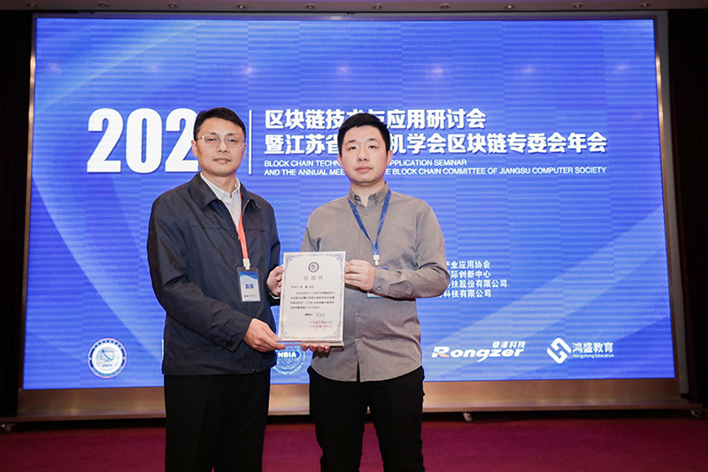 本次大会的技术报告阶段由南京邮电大学计算机学院、软件学院、网络空间安全学院副院长张伟教授主持,来自南京纯白矩阵科技有限公司的吴啸先生、江苏荣泽信息科技股份有限公司的田潇先生以及江苏鸿盛教育科技有限公司的洪明先生分别作了“区块链与定义规则的创新”、“ 区块链与联邦学习的交融使能”、“ 基于底层可信套件的区块链实践教学”等技术报告。大会向演讲者颁发了致谢牌。