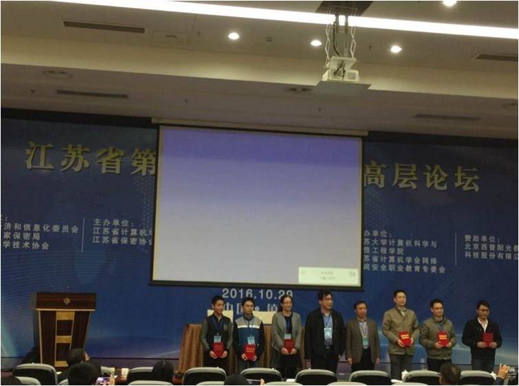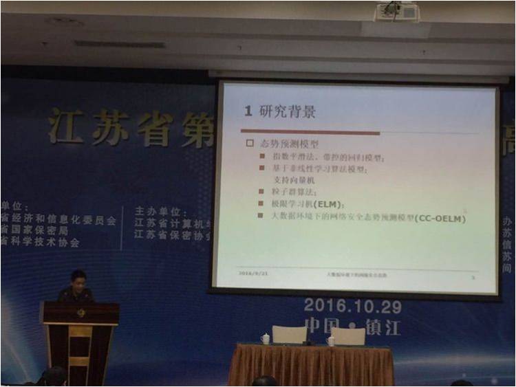 南京信息工程大学计算机与软件学院副院长沈剑教授作“云计算中安全的数据共享和存储审计方案的研究”报告,提出了一个利用基于属性加密技术的城市数据共享的系统架构。该利用基于属性的密码学减轻云应用中的管理负担,数据的访问结构和加密由数据属主控制,从而达到安全数据共享的目的。江苏科技大学计算机科学与工程学院李永忠教授作“工业控制网络安全”学术报告,他列举了当前工业控制网络安全威胁的种种表现,提出了工业控制网络安全可实施策略。淮海工学院计算机工程学院赵启升副教授作“大数据环境下的网络安全态势建模与预测” 学术报告,报告提出一种大数据环境下的网络安全态势预测模型。首先根据网络安全态势的时变性和非线性,采用极限学习机对其进行在线建模;然后利用Map/Reduce编程框架对网络安全态势预测模型进行并行化处理,最后采用Honeynet数据集对其性能进行对比分析。结果表明,本文模型不仅大幅度缩短了网络安全态势的训练时间,而且可以准确描述网络安全态势变化趋势,可以满足网络安全态势预测的实际应用要求。
