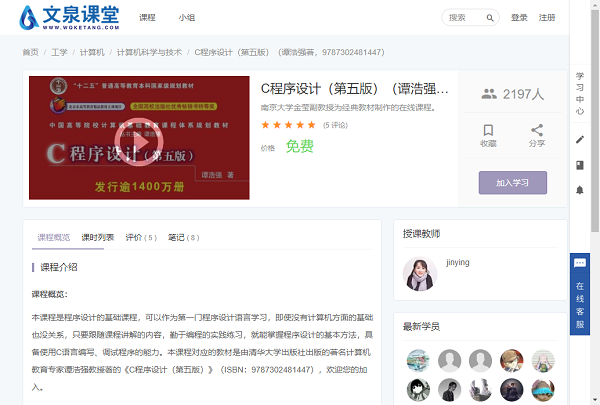 本课程是程序设计的基础课程,可以作为第一门程序设计语言学习,没有基础也没关系,只要跟随课程讲解的内容,勤于练习,就能掌握程序设计的基本方法,具备使用C语言编写、调试程序的能力。本课程对应的教材是清华大学出版社出版谭浩强教授编写的《C程序设计(第五版)》。