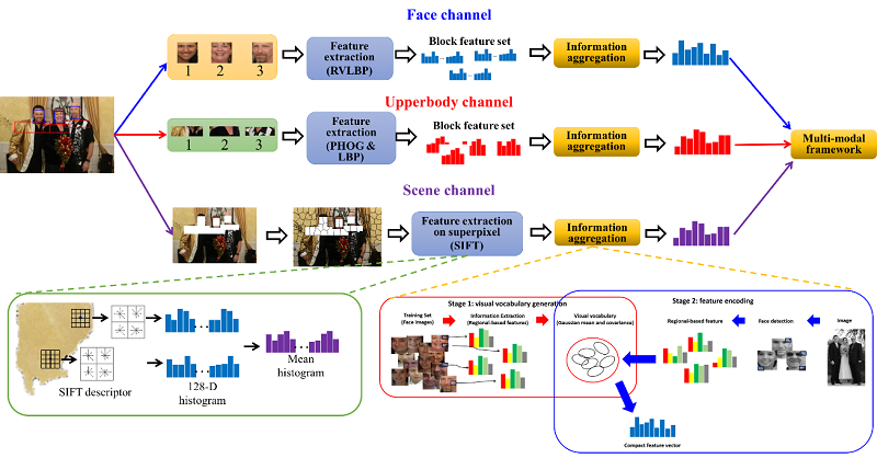 从社会科学的角度来看,理解与识别社会群体情绪在如何高效地组织社会群体性活动方面变得越来越重要。从人类行为自动理解的角度出发,分析和模拟图像中参与社会事件的人群所表现出的影响有重要意义。研究提出了一种估计图像中人群幸福感强度的策略。首先考虑不同Riesz人脸的邻域变化,结合Riesz变换和基于Riesz的局部二值模式描述子,利用连续条件随机场构造了一个新的考虑全局和局部属性的群体情绪模型,提出了一个多模态框架,以提高社会群体情绪分析在复杂应用环境的可靠性,研究了一种生成人脸、上半身和场景特征描述的信息聚合方法,获得群体级别中群体的特征信息。在此基础上,采用局部多核学习融合人脸、肢体和场景信息,从而增加系统的鲁棒性。经过研究,设计了一种基于动态人脸表情分类中的时间序列核方法,从群体层面有效地分析群体行为,并设计了支持向量机和组合全局对齐核以更好地识别群体情绪。实验结果表明,该方法在社会群体识别方面效果较好,显著提高了每个全局对齐核的判别能力。