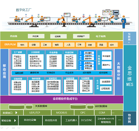 金思维智能制造执行系统以提高制造企业生产力为基本使命,秉持数字化精益管理理念,综合运用智能终端、物联网、大数据、二维码、移动计算等新一代信息技术,对制造企业的人、机、料、法、环等生产要素进行全面管控,以先进信息技术力促企业生产制造管理优化,以管理优化带动提升企业生产制造能力,缩短交期、提高质量、降低成本,进而提高制造企业经济效益。