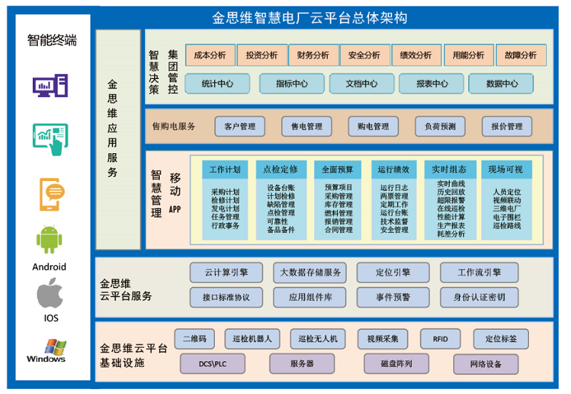 金思维智慧电厂云平台系统具备完整的信息化功能集,具体包括生产管理、资产管理、经营管理、指标管理、实时系统、指标管理等,适用于火电、风电、垃圾发电、生物质发电等各类发电企业。金思维智慧电厂云平台系统获 “中国智能制造优秀推广产品解决方案”,该平台已在中国环境保护集团、中国水电集团等上百家发电集团、能源企业得到成功应用。