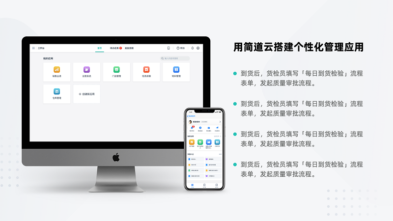 作为一款强大易用的应用搭建工具,简道云支持用户根据自身需求、在线零基础搭建个性化管理应用。无论是数据的收集、分析、查询、共享、推送;成员之间的协作、分权、提醒;上下级之间的审批、工序流程等等,都可以在简道云中实现。 企业将搭建好的简道云应用绑定到企业微信/阿里钉钉,即可实现全员移动办公。从简单的问卷调查、报名签到,到企业内的人事行政、财务管理、流程审批、采购销售、客户管理、资产管理、项目管理等,都能见到简道云的身影。