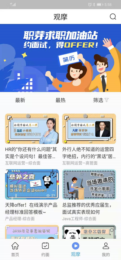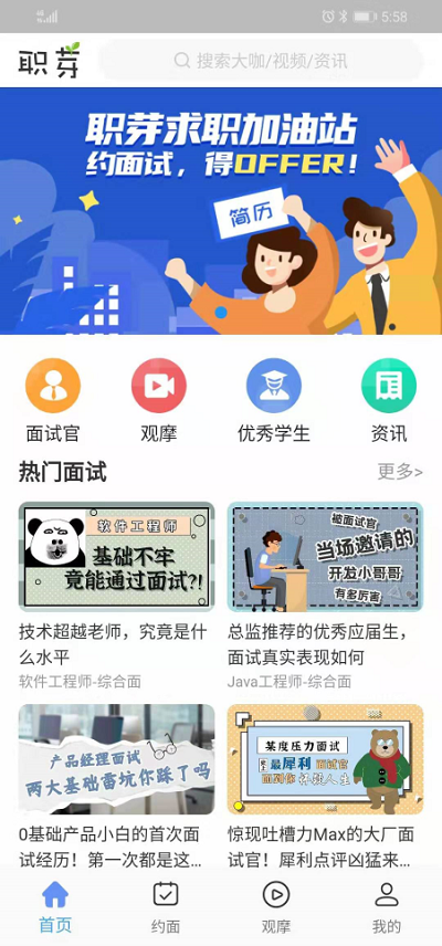 服务于高校,全面提升应届生的求职能力,通过约面与观摩的核心模式,通过在线预约职业规划、面试的实战,或者观摩他人的面试经验,通过所见即所得的方式,旨在让学生能够更方便更有效的提升求职能力。