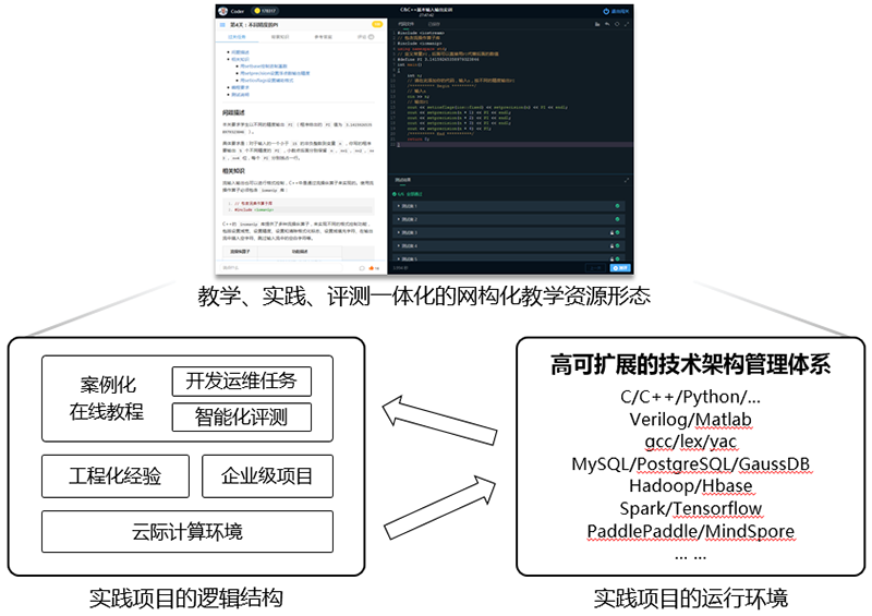 实践教学应用服务平台是一个以教学课堂为核心的平台。实现线下课堂与线上教学的衔接,实现跨班级、跨学期的高效组织、管理和资源共享。支持教师和学生围绕课堂学习开展实践,提供了实践任务发布、实践作业管理、实践过程管理、实践活动分析等群体协同工具以及活跃度排序、作业质量分析等实践过程数据分析评估工具,实现对学习过程的管理、学生编程作业的自动评测和能力评估。
