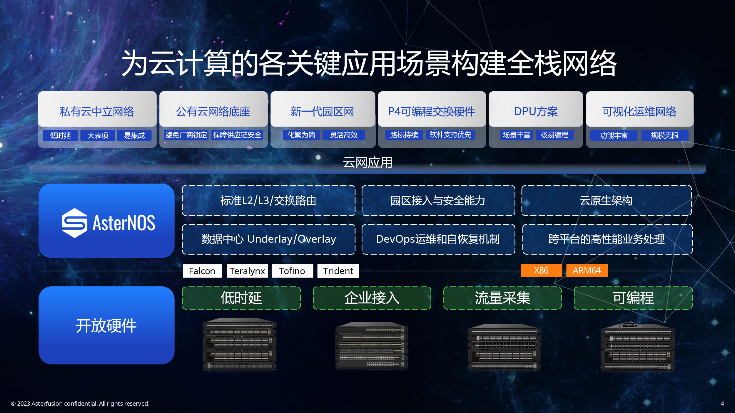 跨场景:AsterNOS基于不同客户场景进行了功能特性的丰富,实现了场景驱动(私有云、公有云、算力/存储/安全承载、企业及智慧园区、可视网络等)特性的优化与增加,如ARP-to-HOST、带内网络遥测(INT)、Voice