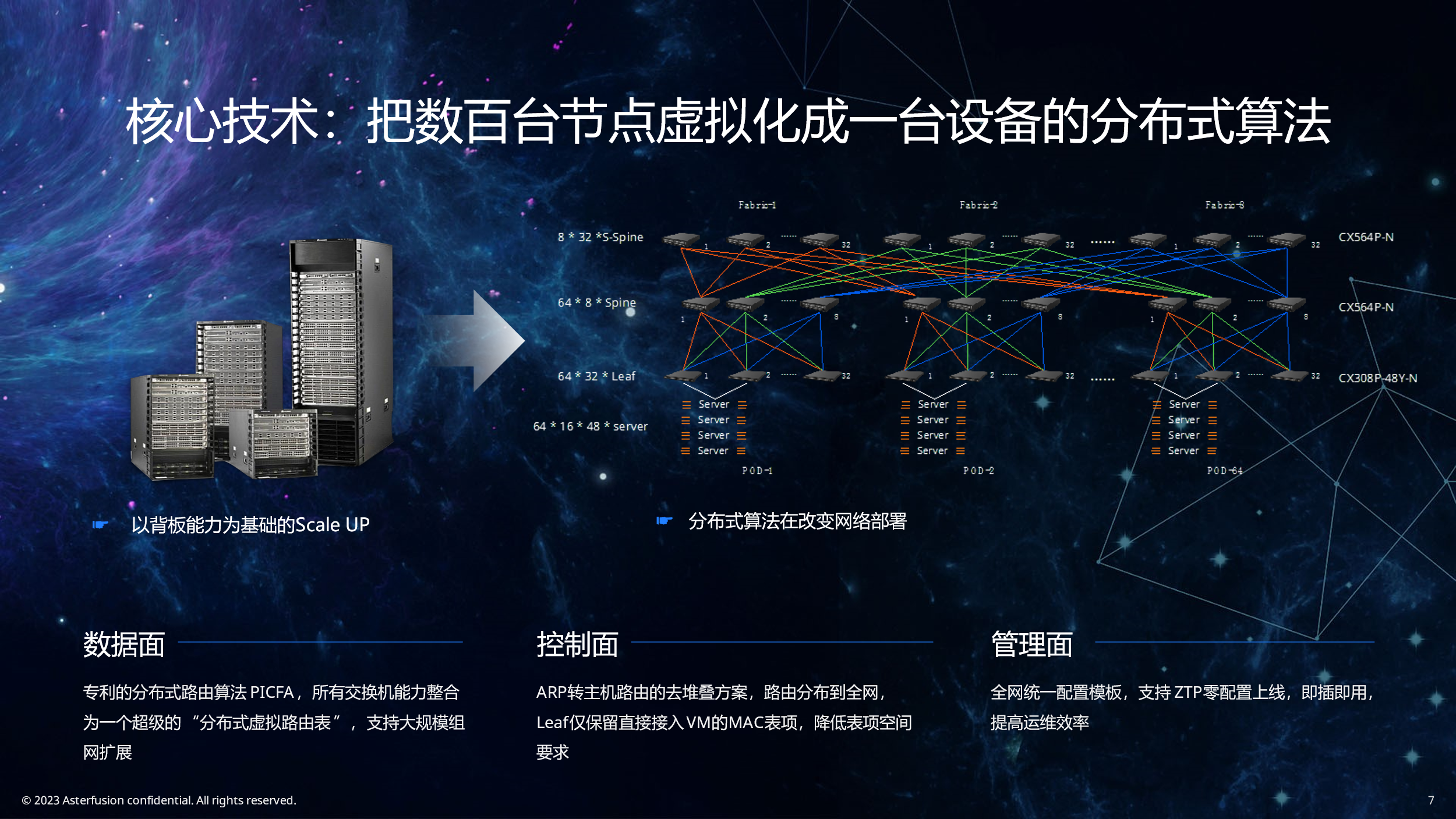 借助于我们高密度、大容量的盒式设备,可以将禁锢在机箱内的CLOS架构分布到网络中,将网络的规划、部署、调整、优化等的主动权交还给用户,从而大幅降低建设成本,提升可扩展性,基于我们专利的分布式算法,可以轻松实现千万级虚机规模的网络部署。
