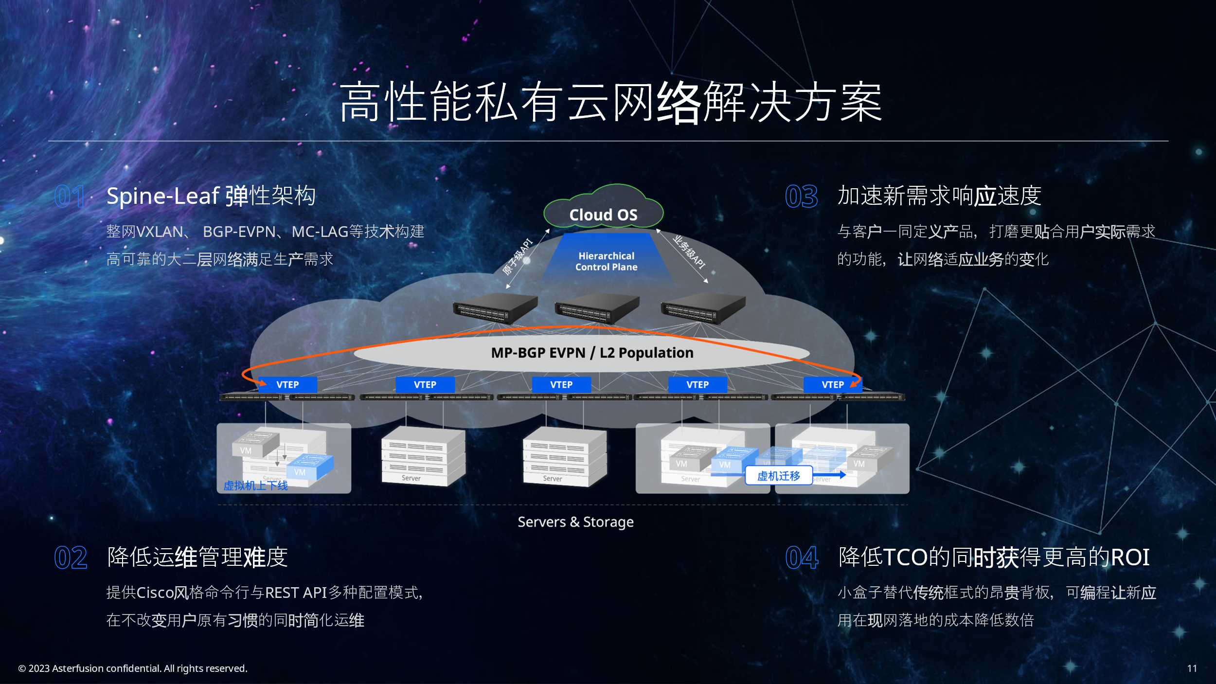 在高性能的私有云网络中,采用Spine-Leaf弹性易扩展架构,通过BGP EVPN、VXLAN等技术,将云中租户的虚拟网络和分布式网络功能网关从计算空间中卸载出来,直接承载在交换机之上,让这部分被释放的服务器计算力可以用于创建/承载更多业务的虚拟计算节点,从而提高服务器CPU计算力的使用效率。同时,交换机提供了思科风格命令行以及Rest API接口,在不改变用户原有习惯的条件下简化运维。依托于系统“高内聚,低耦合”特性,能够和用户一同定义产品,打磨更贴合用户实际需求的功能,让网络能够不断的适应业务的变化。