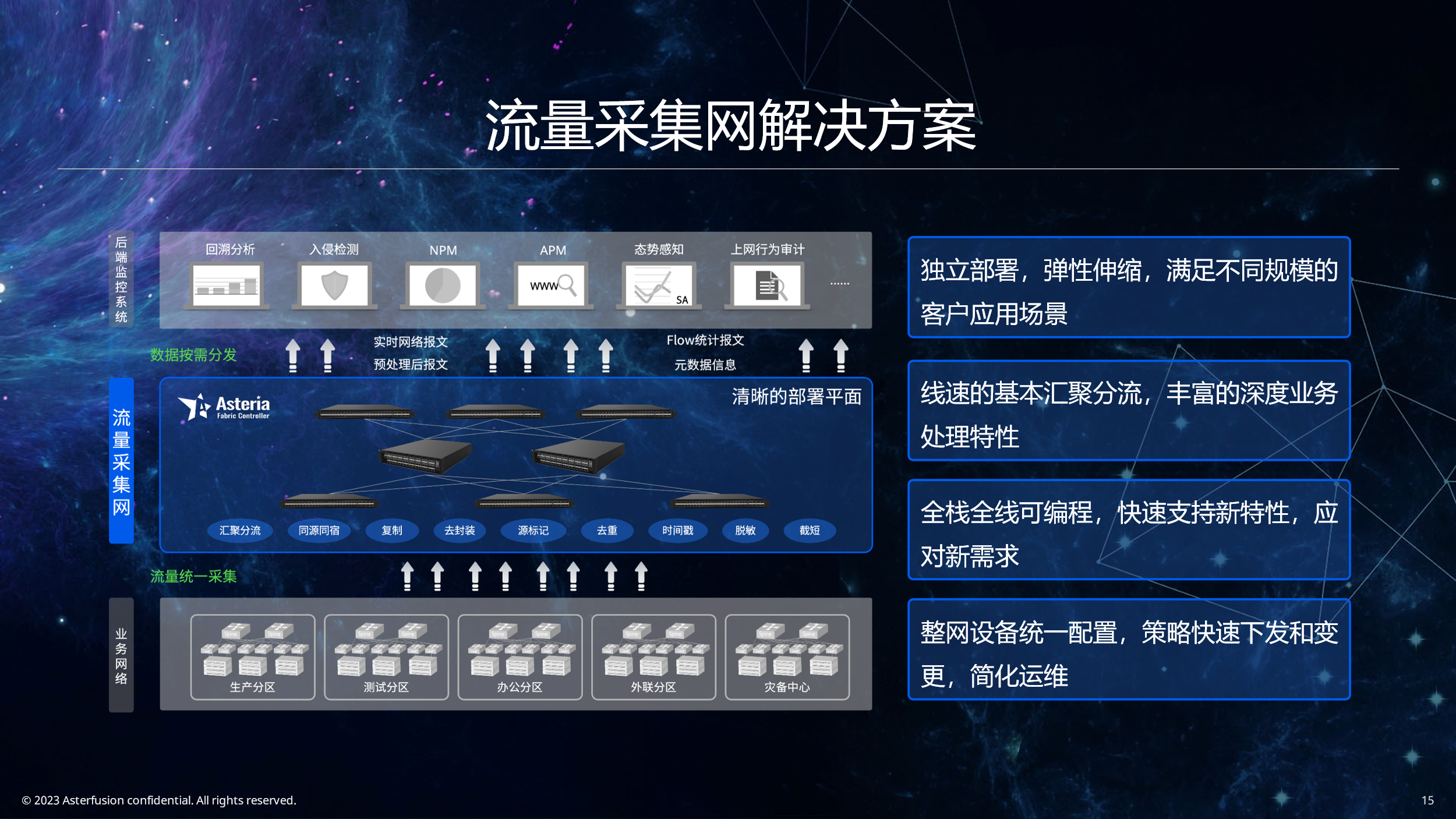 随着业务的增长,业务网络的网络监控、安全合规、数据分析和挖掘日渐成为客户网络建设中重要的一个组成部分,传统孤岛式分散部署、单点采集的方案给客户网络部署和运维带来了极大的挑战。而将流量采集网作为独立于业务网、管理网之外的“第三张网”建设也已经成为行业共识。