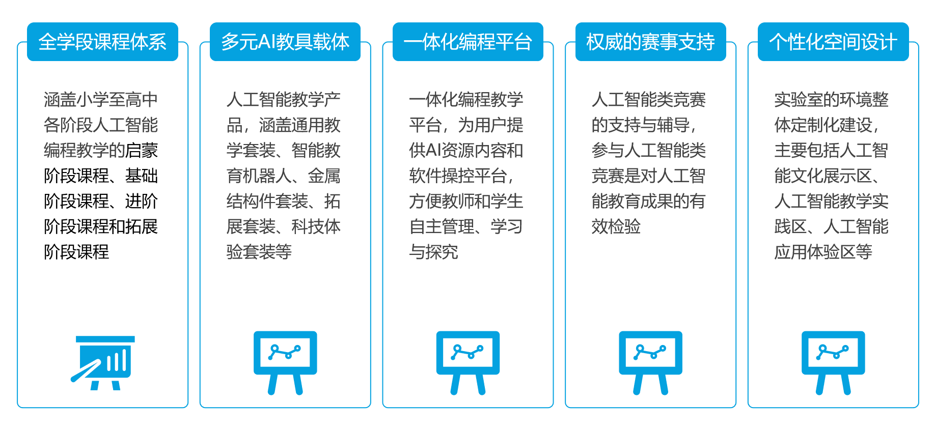 个性化空间设计:为学校提供实验室的环境整体定制化建设服务,主要包括人工智能文化展示区、人工智能教学实践区、人工智能应用体验区等。充分实现理论和实践的结合应用,助力学校人工智能教育的高效发展。