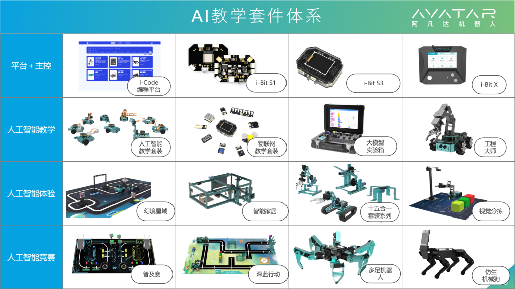 多元AI教具载体:阿凡达机器人自研多款人工智能教学产品,涵盖通用教学套装、智能教育机器人、金属结构件套装、拓展套装、科技体验套装等。充分满足日常教学、创新应用以及各类AB赛事需求;