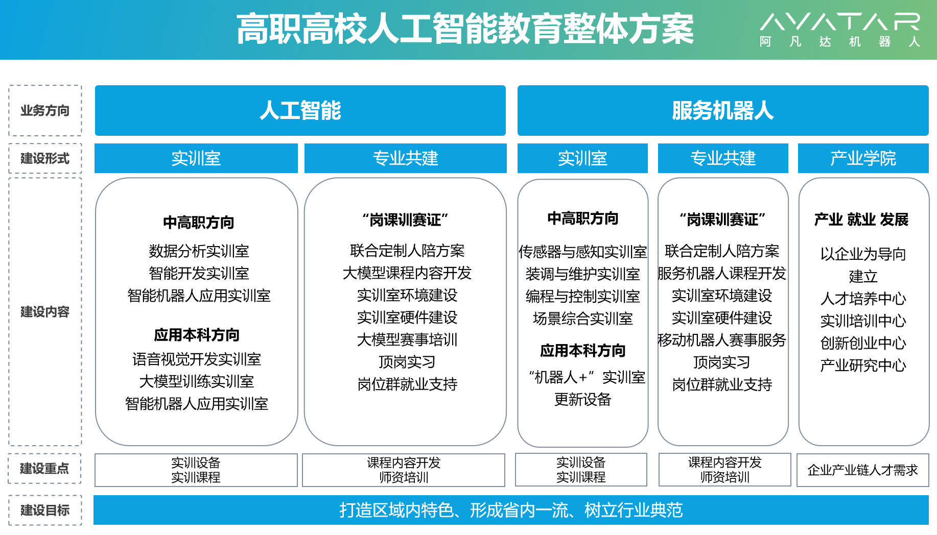 高职高校人工智能教育解决方案主要有“人工智能”和“服务机器人”两大专业方向,可与院校联合进行实训室搭建、专业共建、产业学院筹建三大服务应用,并通过师资培训、权威竞赛、技能认证、就业支持等维度,全面提升人才职业竞争力。目前已与南京大学、南京航空航天大学、北方民族大学、厦门大学、华南师范大学、湖南邮电职业技术学院、江苏省灌南中等专业学校、银川职业技术学院等知名院校展开合作;